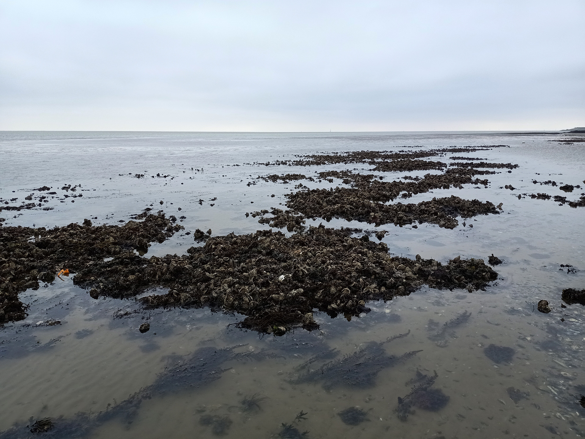 Zie jij hier, vanaf de dijk, dikke zwarte strepen in de zee, ongeveer 200 meter uit de kust? Dat is een oesterbank. Wat weet jij al over oesterbanken? toon op kaart